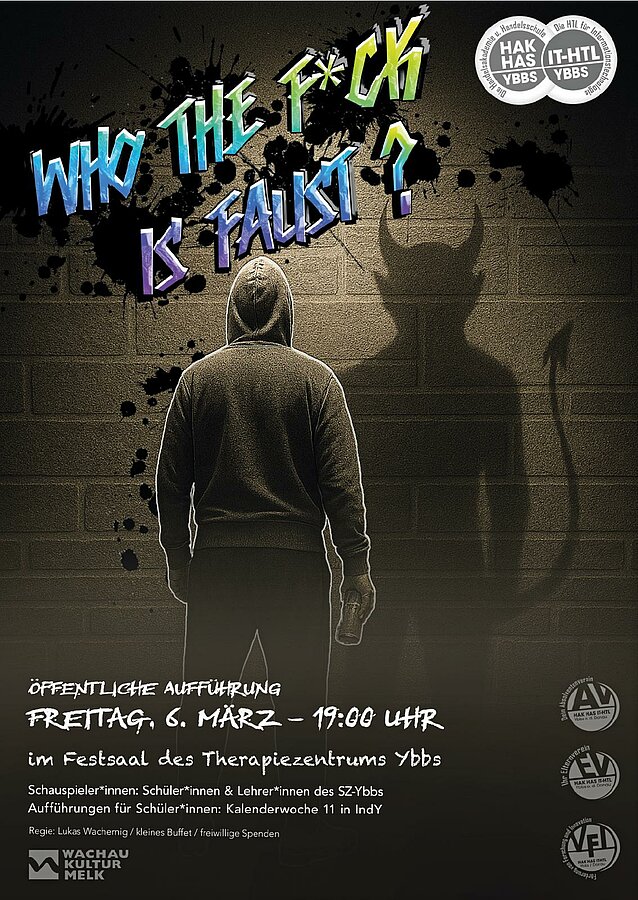 Im Schulzentrum Ybbs wird seit Jahren Theater gespielt – und auch in diesem Schuljahr bringen wir wieder ein Stück auf die Bühne. Wir laden Sie herzlich zur öffentlichen Aufführung von „Who the f*ck is Faust?” ein (Textfassung frei nach Johann Wolfgang Goethe von Lukas Wachernig). Auf Sie wartet ein Theaterabend, der von Schülerinnen und Schülern sowie Lehrkräften des Schulzentrums Ybbs gemeinsam erarbeitet und gestaltet wurde.